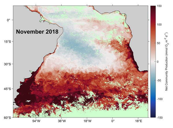 Net Community Production, or NCP, is a measure of the balance between phytoplankton photosynthesis and the respiration of the whole plankton community. A positive value for NCP indicates an uptake of CO2 by the plankton community, whereas a negative value occurs where CO2 is actually released. This new satellite NCP timeseries indicated that wind speed and mesoscale features drive regional NCP variability in the South Atlantic Ocean. This has key implications for the biologically driven exchange of CO2, carbon transfer into the deep ocean and carbon available for transfer up the food web in the region.